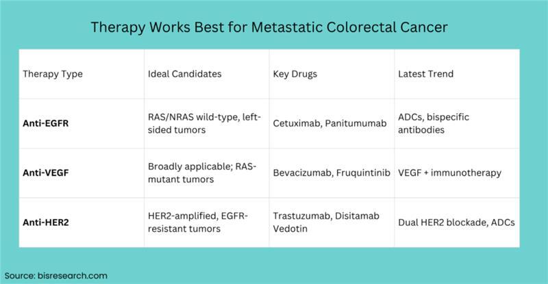 Metastatic colorectal cancer (mCRC) continues to be one of the leading causes of cancer-related deaths globally. However, precision oncology has transformed how clinicians' approach mCRC treatment. Targeted therapies, particularly anti-EGFR, anti-VEGF, and anti-HER2 therapies, have redefined survival outcomes and quality of life for patients.