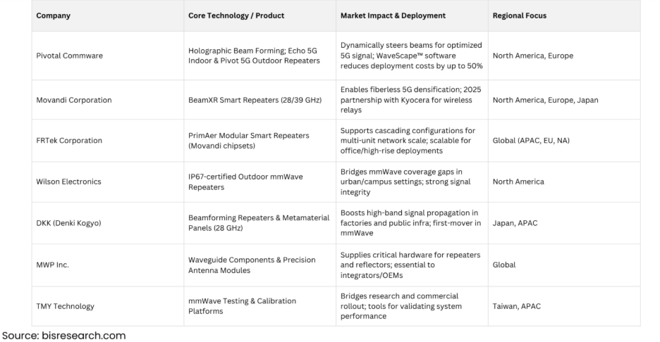 Japan’s DKK brings decades of RF engineering experience to the mmWave domain. Its 28 GHz beamforming repeaters and metamaterial reflector panels are designed to enhance high band 5G signal propagation in smart factories and public infrastructure. DKK’s strong domestic partnerships with Japanese telecom providers give it an early-mover advantage in Asia’s high-frequency network buildout.
