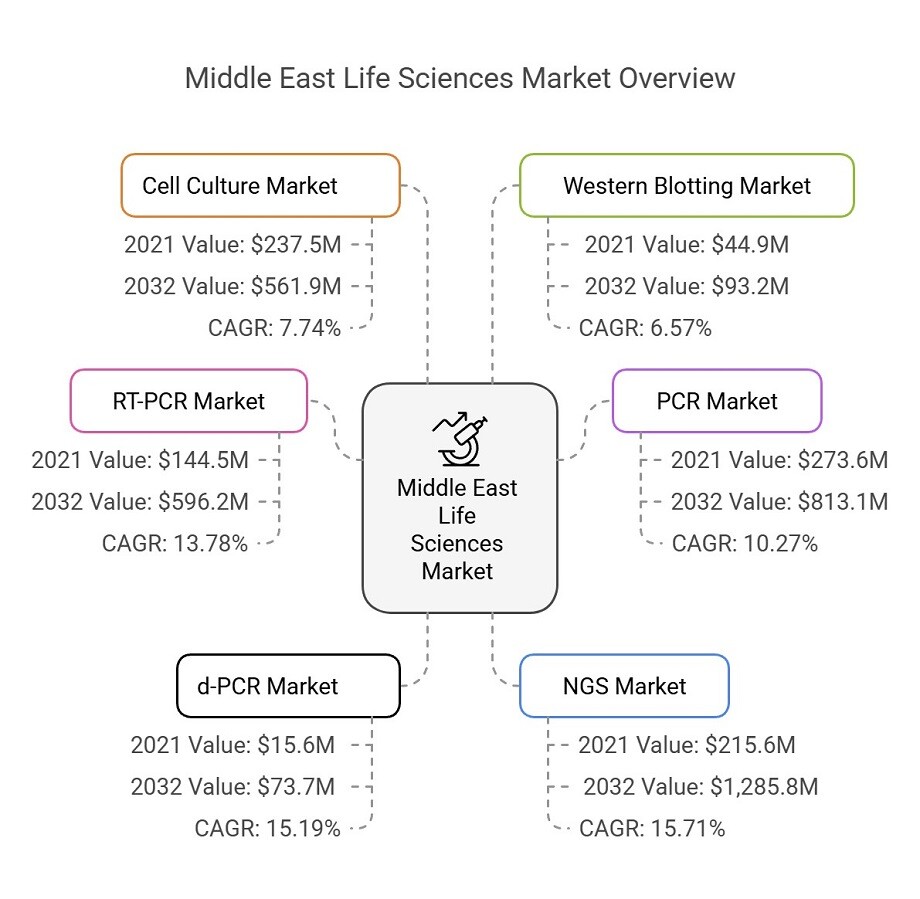 The life science market in the Middle East is undergoing a major transformation, driven by the increasing demand for advanced testing technologies in clinical diagnostics, infectious disease detection, oncology, and personalized medicine. Key technologies fueling life science market segment growth include RT-PCR, conventional PCR, digital PCR (d-PCR), next-generation sequencing (NGS), cell culture, and Western blotting. Backed by regional life science research and technological advancements, this market is attracting significant attention from both global players and local innovators.