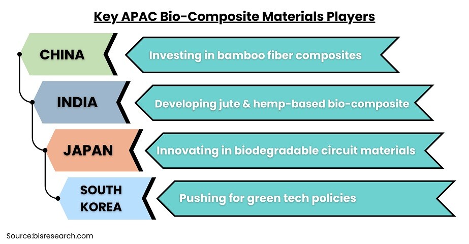 The Asia-Pacific (APAC) region is emerging as a leader in bio-composite materials, driven by environmental concerns and government policies promoting sustainability. Bio-composites, made from natural fibers and biodegradable polymers, are being integrated into electronic components to reduce e-waste and carbon footprints. Applications of bio-composite materials in electronics include biodegradable circuit boards, eco-friendly casings, and sustainable packaging solutions. Regulatory support from APAC governments, combined with consumer demand for sustainable products, is expected to accelerate the adoption of bio-composites in mainstream electronics manufacturing.