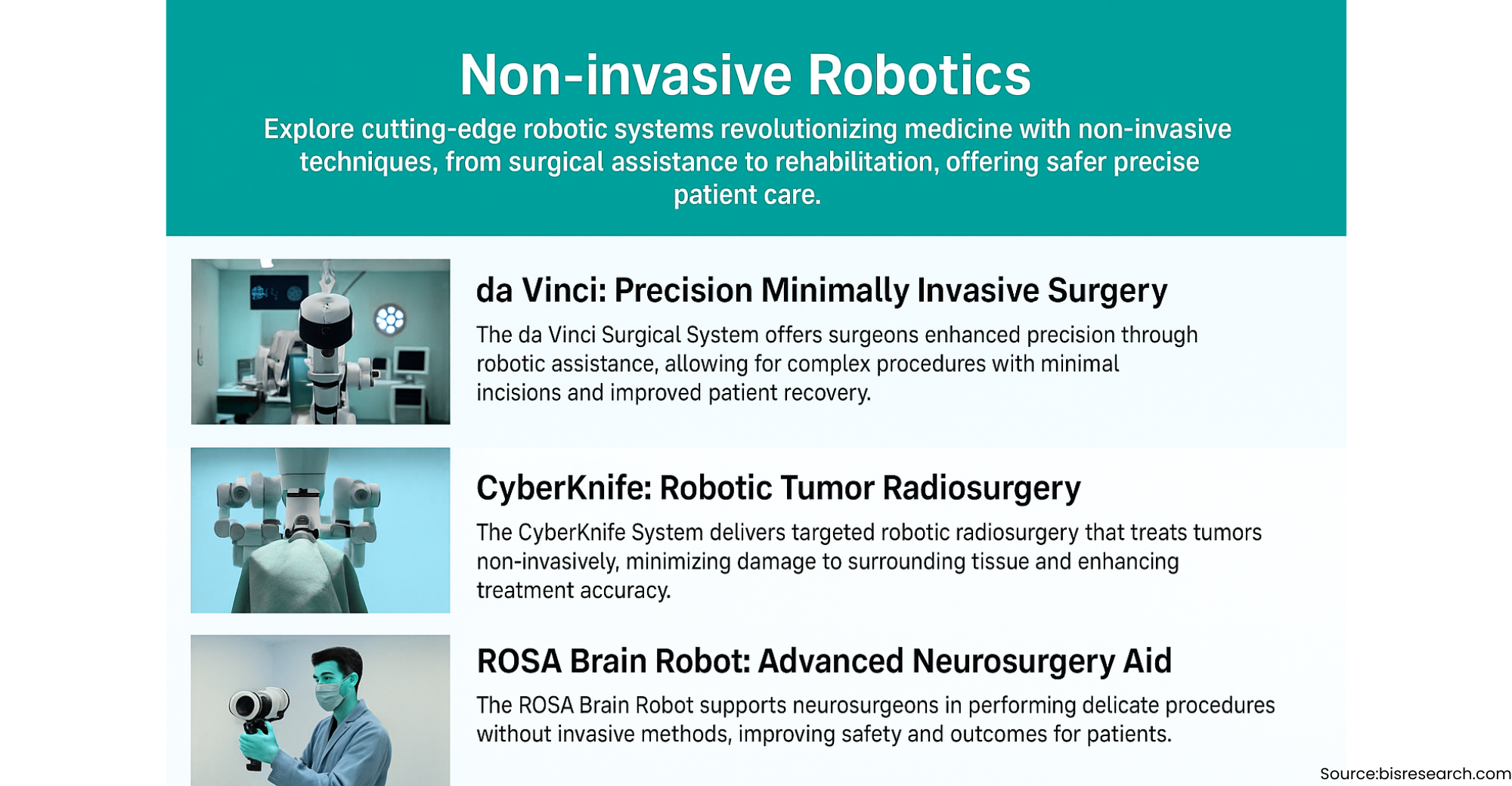 Driven by global demand for precision, efficiency, and patient safety, the non-invasive robotics market is projected to grow at over 15% CAGR through 2030. Integration of robotics with machine learning and 3D visualization will expand their utility across both clinical and industrial ecosystems.